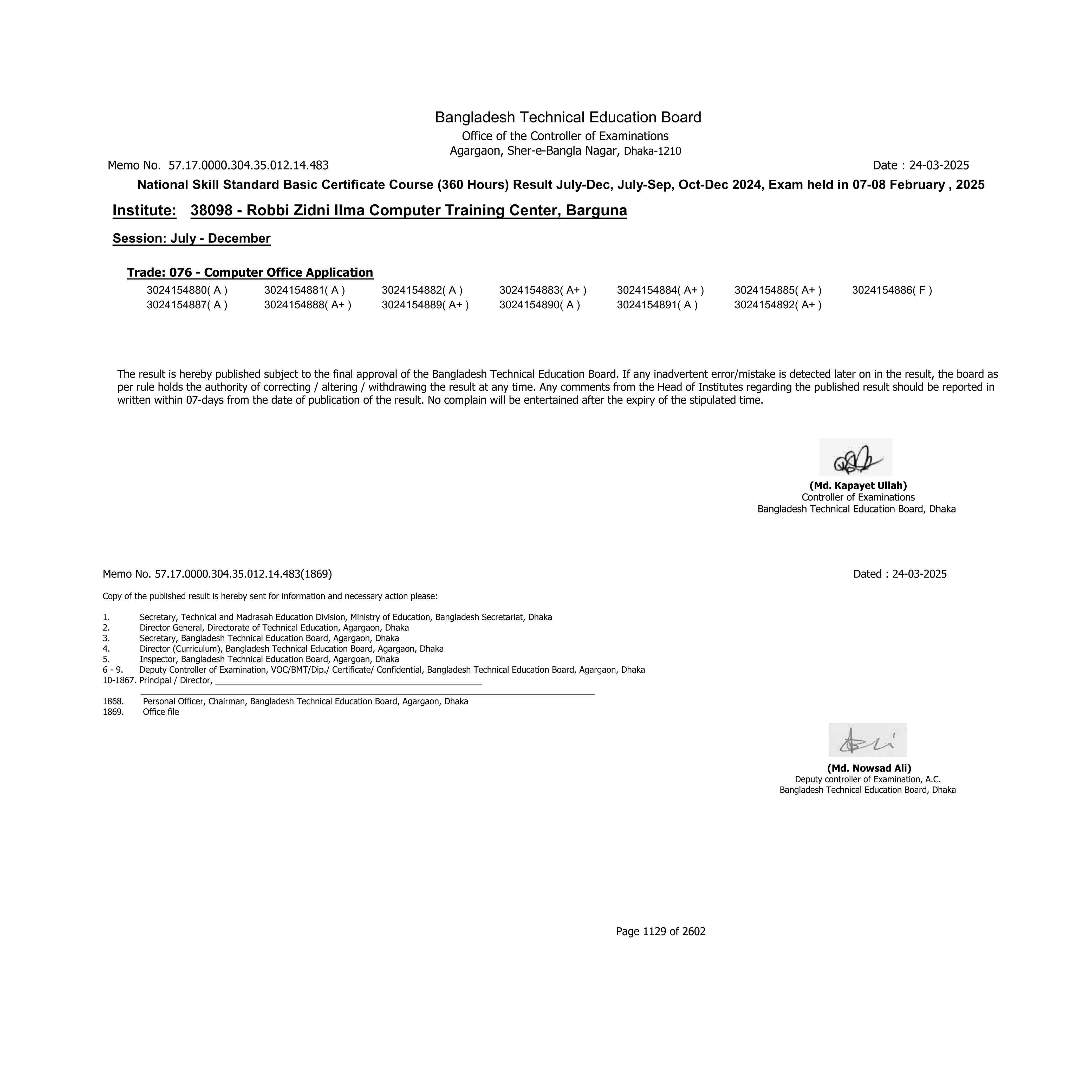 18.Sep.2025 National Skill Standard Basic Certificate Course (360 Hours) Result Jan-Jun,April-Jun- 2025, Exam held in 18-19 July 2025 View Download